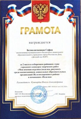 2024 г. — Диплом Лауреата 1 степени в 5 Всероссийском патриотическом конкурсе (педагоги: Клименко Е.Л., Кошель А.И., Мережко Е.Л.)