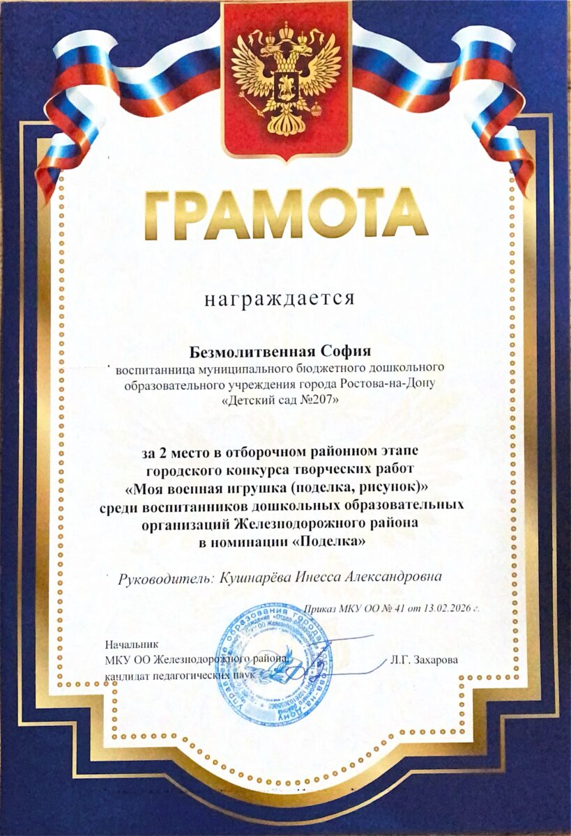 2025 г. — Диплом призёра районного этапа конкурса «Учитель года города Ростова-на-Дону -2026» в номинации «Воспитатель года», занявший 2 место, Аверьнова Оксана Юрьевна, воспитатель МБДОУ «Детский сад №207»