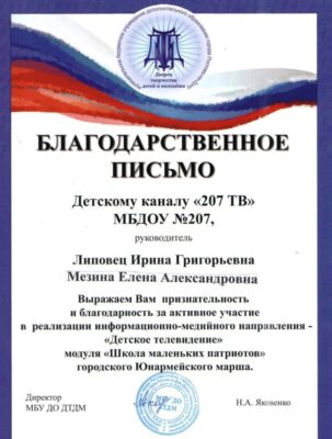 Одно из направлений работы отряда «Горящие сердца»: информационно-медийное. На базе МБДОУ №207 работает «Детское телевидение»: «207-ТВ». Маленькие патриоты вместе с педагогами делают репортажи, берут интервью, освящают важные события детского сада.